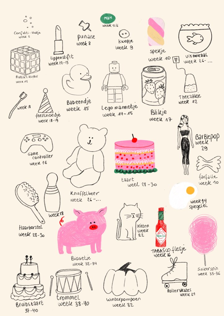 A child-friendly growth chart to follow the weekly development of the baby and count down together as a family until birth.